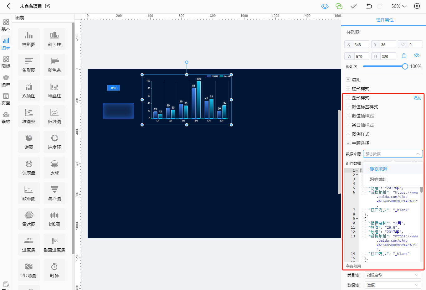 点击基本菜单展开组件列表,单击拖动到大屏中,在右侧可以看到该组件中的可修改属性