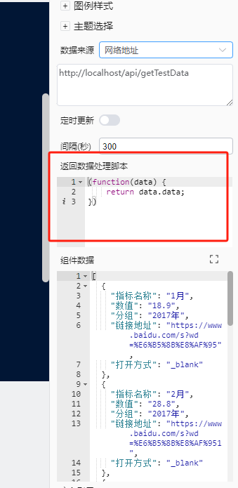 这里主要说明一下数据来源配置,如果是静态数据就按照原有的数据修改即可,如果是需要从API中动态获取,返回的格式需要和静态数据中的格式一致,如果无法自己修改返回数据,可以在返回数据处理脚本中增加一个函数来处理返回值。