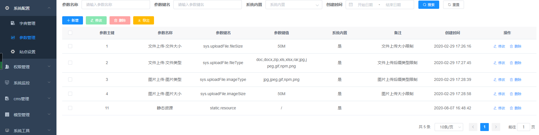 注意:上传参数时可以配置的,在系统后台 >> 系统配置 >> 参数管理 进行附件类型,大小配置。